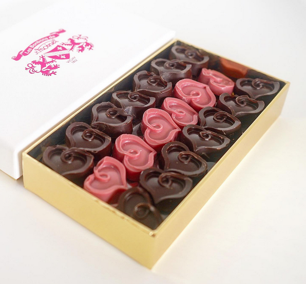 Assortiment de chocolats en forme de cœur, présenté dans un bel écrin (Lions doré ou rose) à conserver !
